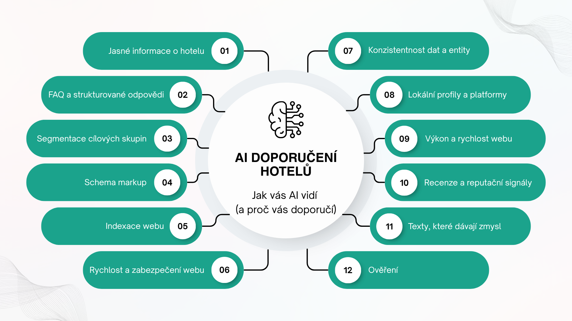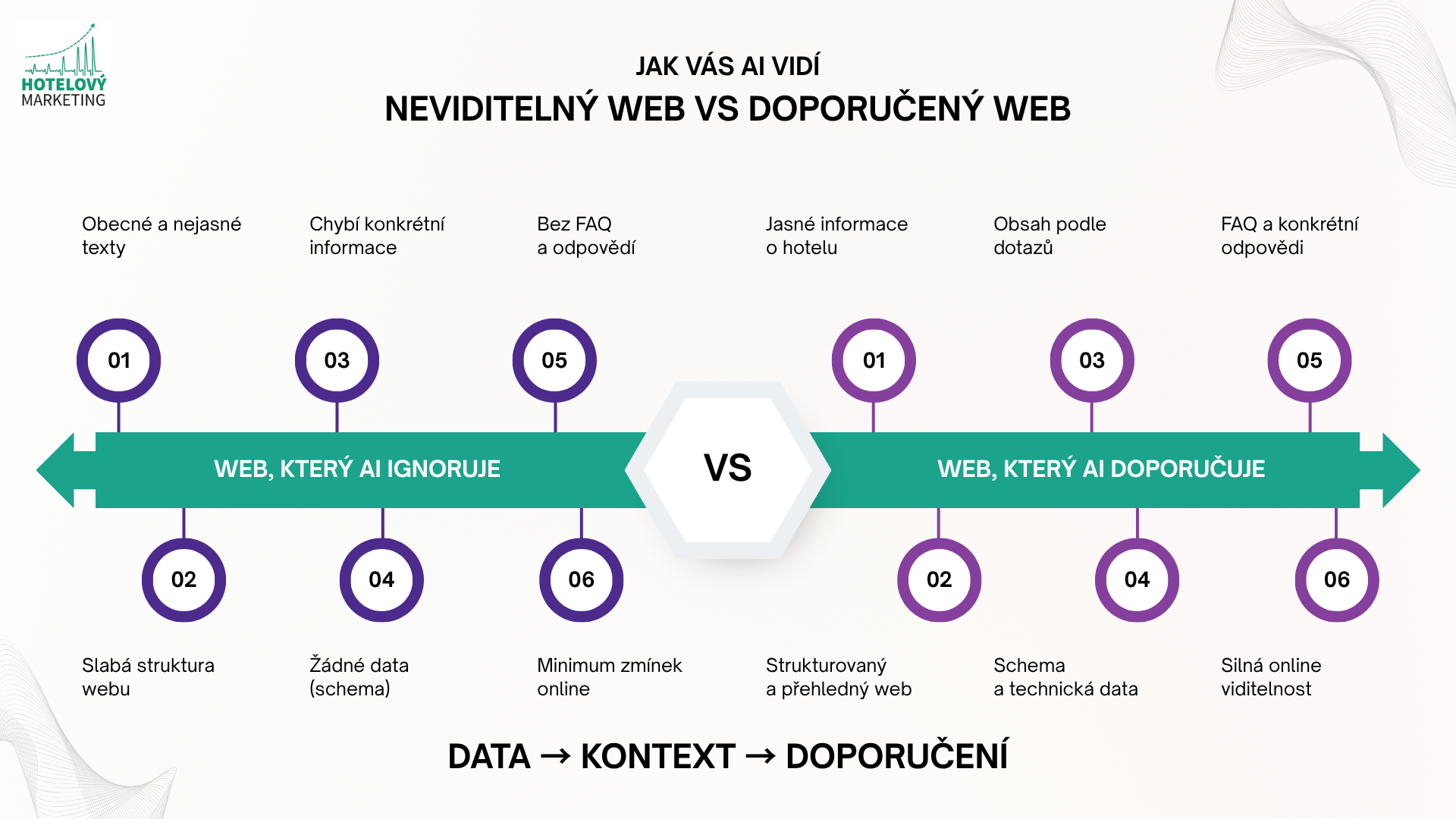 AI systémy dnes nevyhledávají weby stejným způsobem jako klasické vyhledávače. Nesnaží se najít seznam výsledků, ale vytvořit odpověď. Porovnávají dostupná data a vybírají zdroj, který je nejpřesnější, nejjasnější a nejlépe strukturovaný. Pokud chcete být mezi doporučenými hotely, vaším cílem není mít "nejhezčí web", ale web, který dává jasné odpovědi na konkrétní otázky.